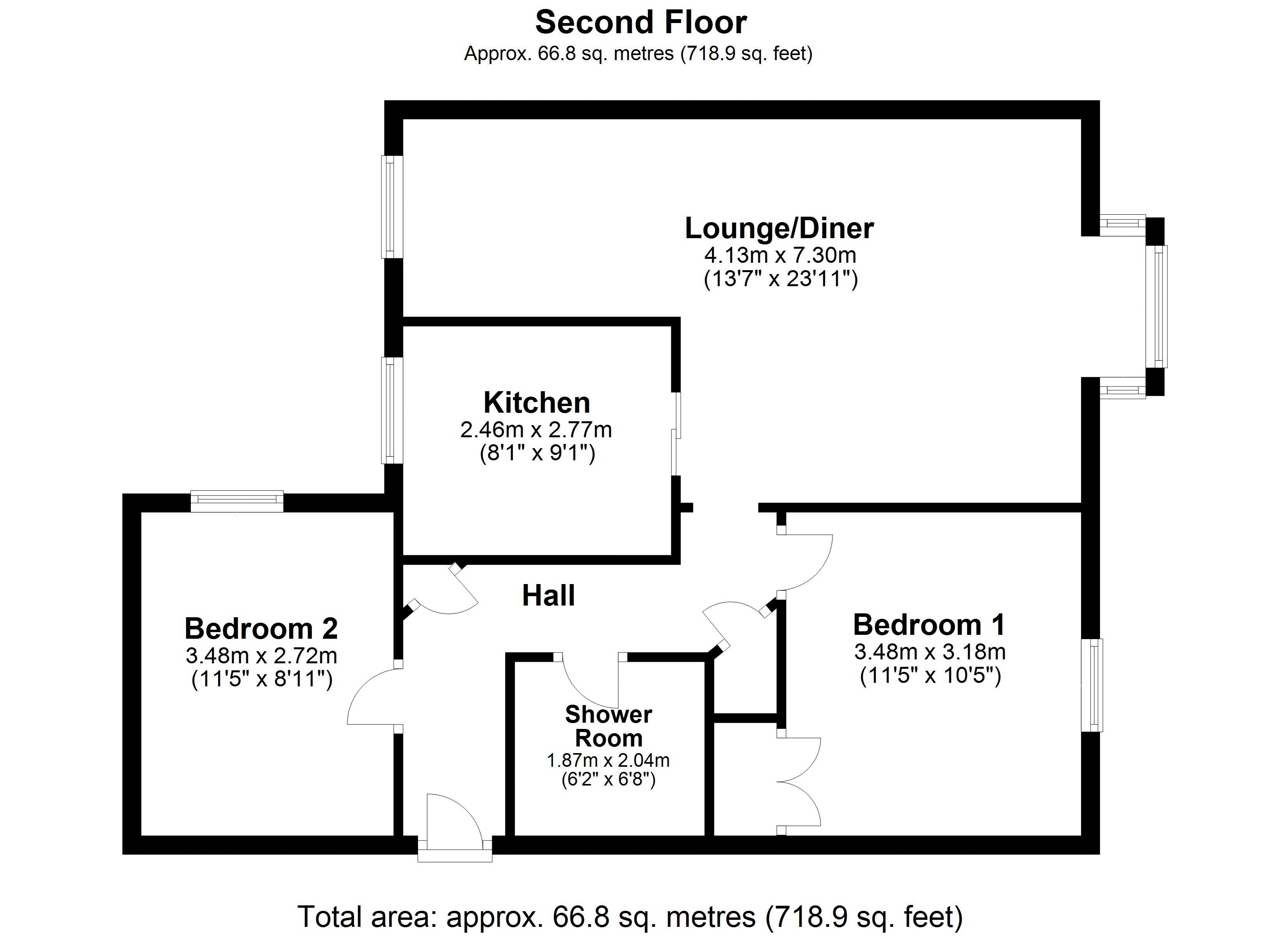 This flat offers two great sized bedrooms the largest offering a fitted wardrobe, a large dual aspect lounge/diner, modern fitted kitchen with built in oven and hob with an extractor hood above and an integral dishwasher. There is also a contemporary shower room with double shower, under sink storage, mirror and heated towel rail. The hall also offers two storage cupboards.